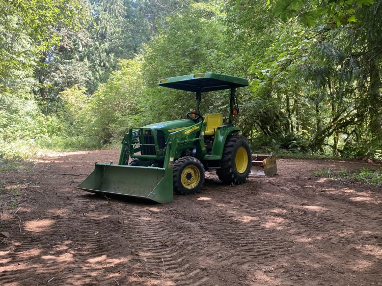 A powerful John Deere 513 60-inch diameter Brush Hog that mulches through the thickest of blackberry shrubs.